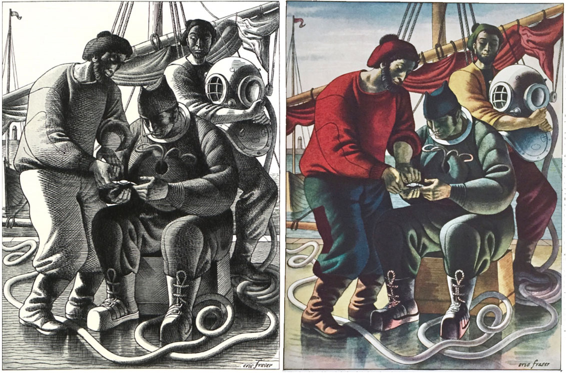 “Fantastic Stories”: The Professor of Milan, The Arduous Voyage of the Cutter “Ituna” & 7 years under the sea (under Greek waters)…note the subtle differences in the color version of The Professor of Milan versus the B&W: the red-hatted sailor is pointing directly to the watch, the curl of the hose near the feet of the blue-hatted diver is smaller, the green-hatted sailor's hands are rendered differently, the signature is slightly different and there are small variations in the rigging behind the sailors.