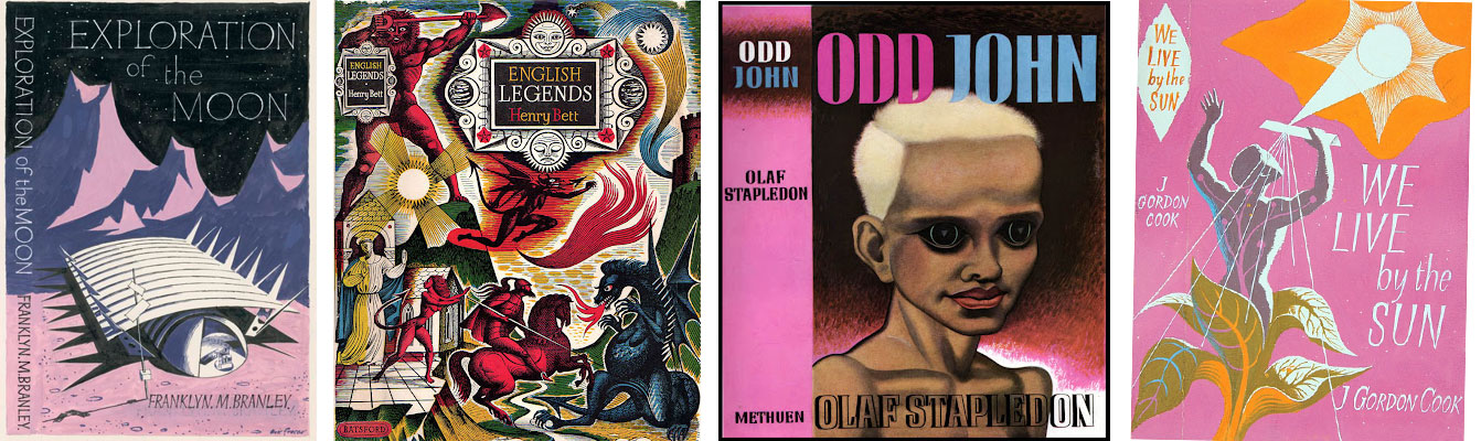 Examples of Eric Fraser's book jacket work: Exploration of the Moon by Franklyn M. Branley (1965), English Legends by Henry Bett (1952), Odd John by Olaf Stapledon (1935) and We Live by the Sun by J. Gordon Cook (1960).
