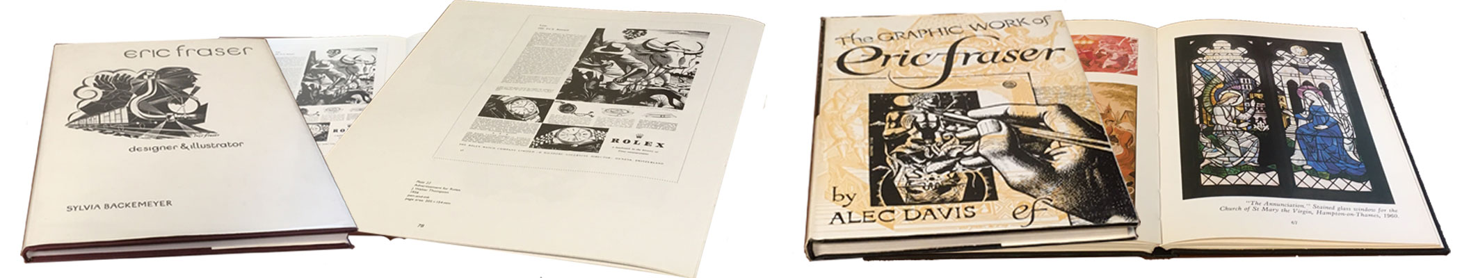 The standard reference books regarding Eric Fraser's work: The Graphic Work of Eric Fraser 1985 (Alec Davis, Uffculme Press) and Eric Fraser: designer and illustrator, 1998 (Sylvia Backemeyer, Lund Humphries). Pictured: Rolex advertisement illustrated by Eric Fraser for the J. Walter Thompson Agency (Rolex advertising agency) & the “The Annunciation”…stained glass window for the Church of St. Mary the Virgin, Hampton-on-Thames, 1960.