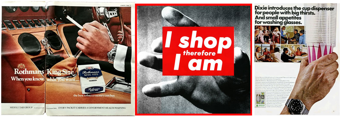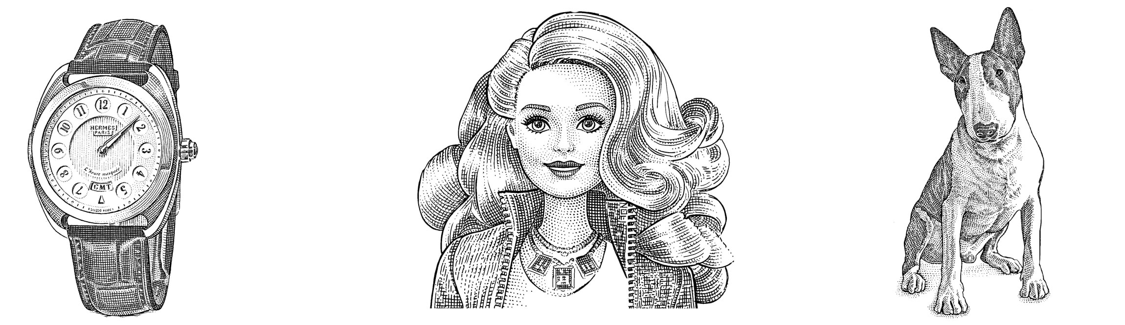 Beginning with the J. Walter Thompson era the quintessential rendering of the Rolex Oyster Perpetual appeared, gracing (in spades) Rolex advertisements between 1947–early 1960s—drawn in black & white and noted by distinctive shading the Oyster Perpetuals appeared in many dial and hands variations (the same aesthetic was applied to the Milgauss, GMT & Tudor Submariner). Though the artist is unknown to the author the watches suggest a single-hand given the manner in which the watches are illustrated—for now it's a mystery to the author. The Oyster illustrations are reminiscent (or rather vice versa) of the headline cut abbr. hedcut illustrations associated with the Wall Street Journal; e.g. Hermés Dressage L'Heure Masquée, Barbie™ and dog.