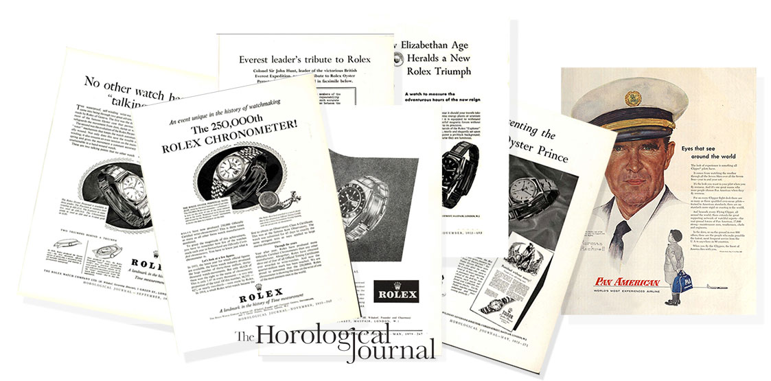 The J. Walter Thompson agency was an all-American company, but it was the JWT London office that forged the Rolex myth. Pictured are London office Rolex advertisements from the Horological Journal during the 1950s: “Rolex Talking Points”, “The 250,000th Rolex Chronometer”, “Everest Tribute to Rolex”, “Presenting the Rolex Explorer”, “Presenting the Tudor Oyster Prince” and “GMT Master” —Rolex-PanAm nexus: Pan-American became a J. Walter Thompson client in 1942.