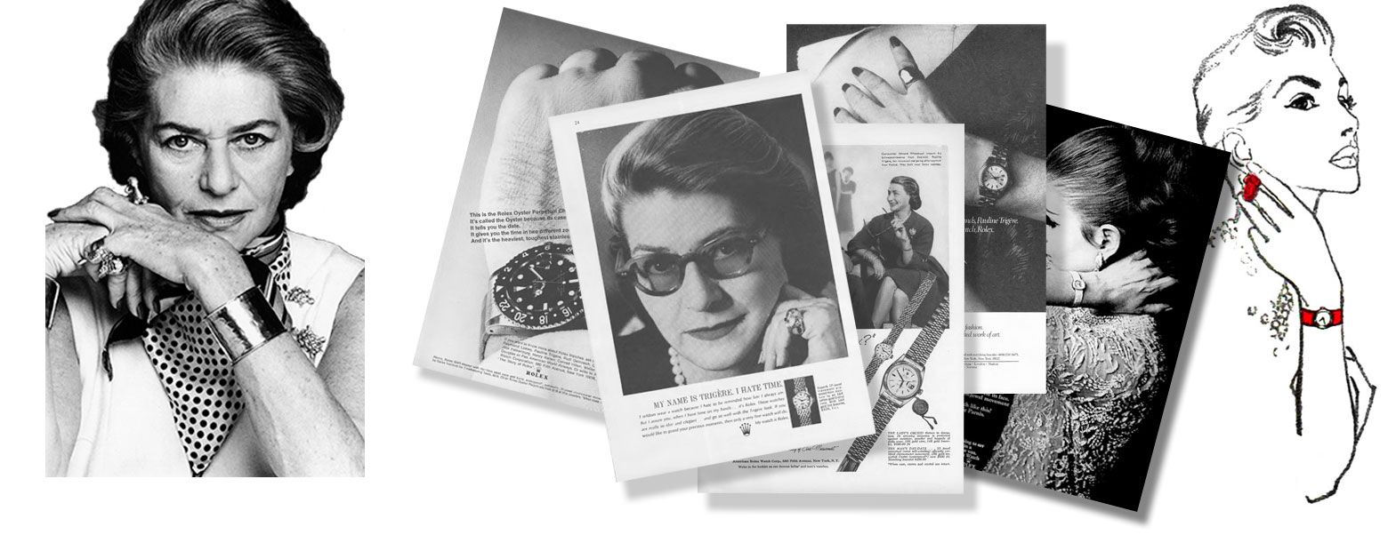 French-American couturiere Pauline Trigère (1908–2002) is featured in three Rolex advertisements (New Yorker Magazine: November: 1962, 1959 & 1977) and mentioned in a November, 1965 New Yorker Magazine Rolex GMT advertisement (“If you want to know more about Rolex watches…ask Pauline Tigère, Rudi Gernreich…or Pan American Airways”) and in a circa 1960s Mollie Parnis (American fashion designer) advertisement: “What to wear with a [Rolex]? Nothing less than a Mollie Parnis. or a Pauline Trigère…”