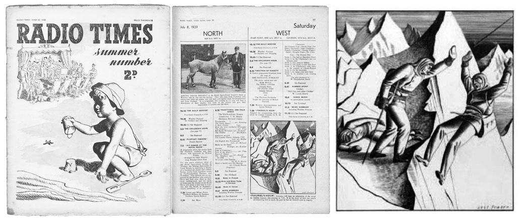 Eric Fraser's only mountain-climbing illustration prior to the “Everest Leader's Tribute to Rolex” was the illustration for Radio Times' radio adaptation of Joanna Cannan's 1931 psychological thriller Ithuriel's Hour—the book concerns the fictional 27,000 ft. Chowo-Kangi (Himalayas) which plays the roll of Mt Everest. The illustration appears in the June 30th, 1939 Radio Times program guide (lower-right).