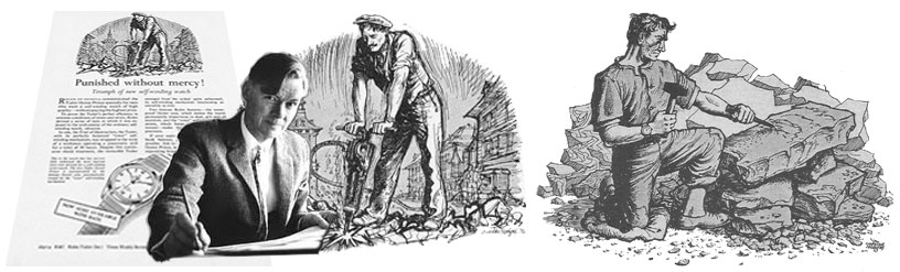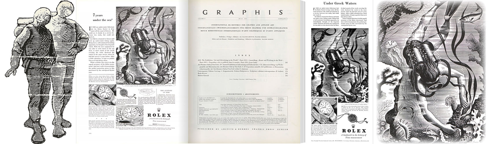 The 1950s long copy campaign JWT mentions (see quote) consisted of many advertisements (eight of the advertisements appeared in Graphis Magazine 1949–1951)—each advertisement displayed a vignette “by” Hans Wilsdorf e.g. The watch that swam the English Channel by Hans Wilsdorf. Though the artwork is sans signature most likely the artist is the Swiss graphic-designer Hans Tomamichel (1899–1984)—Hans Tomamichel illustrated the 1945 Rolex Jubilee Vade-Mecum and was the creator of Knorrli, one of the most-recognizable figures in Swiss advertising.