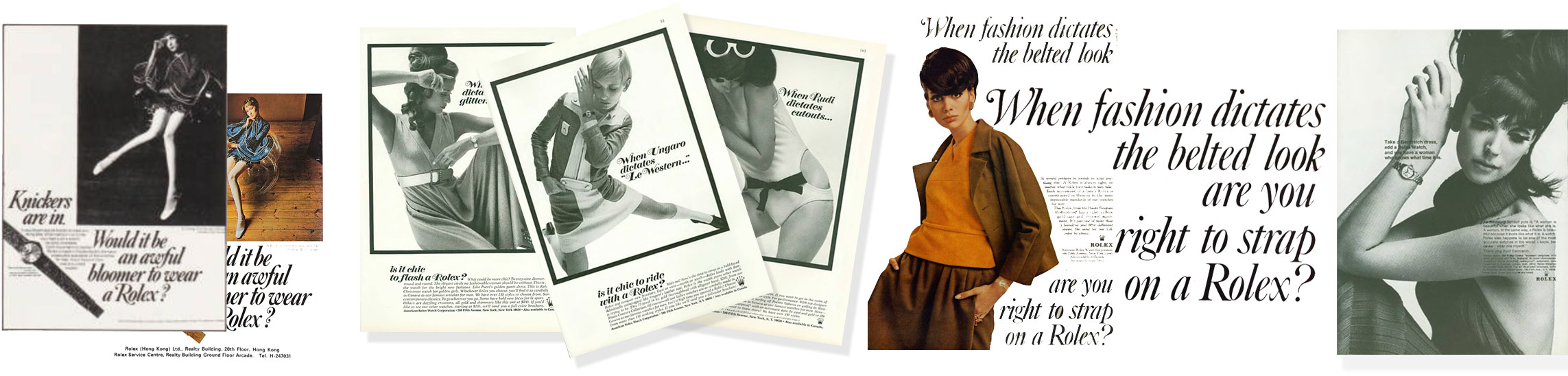 Fashion trumps watches—the “Knickers” advertisement in hindsight JWT calls an oddity. The Pucci (New Yorker Magazine, December 1968), Ungaro (New Yorker Magazine, November 1968) and Rudi (New Yorker Magazine, May 1968) advertisements have the respective taglines: “When Pucci dictates glitter…is it chic to flash a Rolex?”, “When Ungaro dictates ‘Le Western’…is it chic to ride with a Rolex?” and “When Rudi [Gernreich] dictates cutouts…is it chic to cut out with a Rolex?”—the answer is yes, yes, yes. The foremother of the 1968 “When fashion dictates…” advertisements was the November 1967 New Yorker Magazine advertisement: “When fashion dictates the belted look…are you right to strap on a Rolex?”—the tagline is sans designer, but the designer was Jacques Tiffeau. An earlier Gernreich advertisement appeared in the October 30, 1965 New Yorker Magazine.
